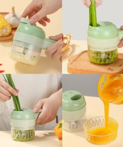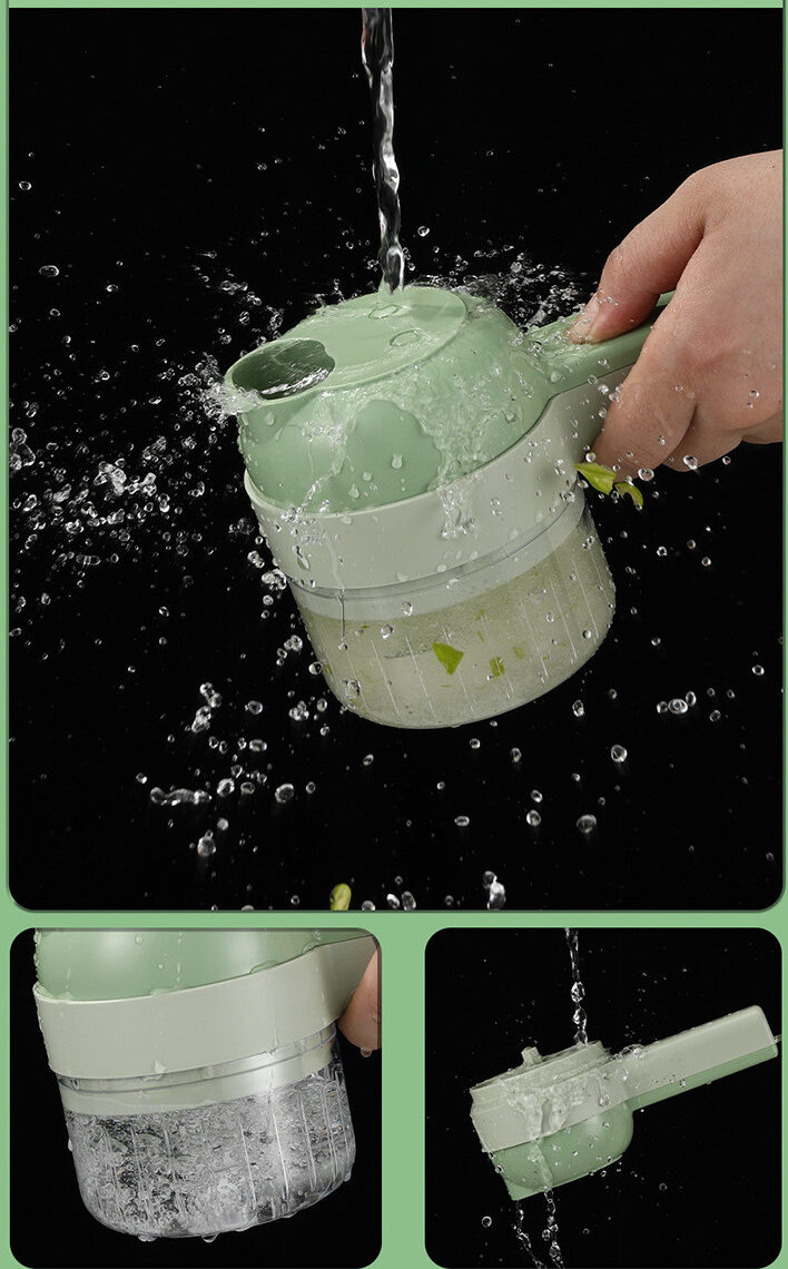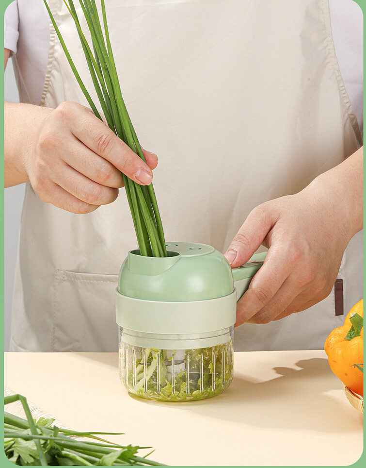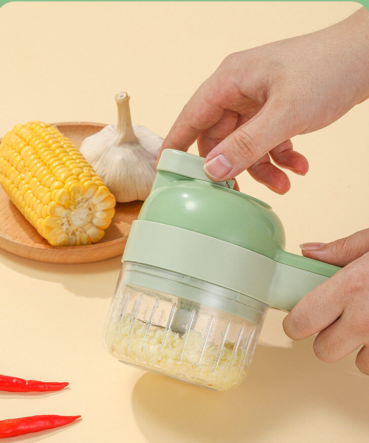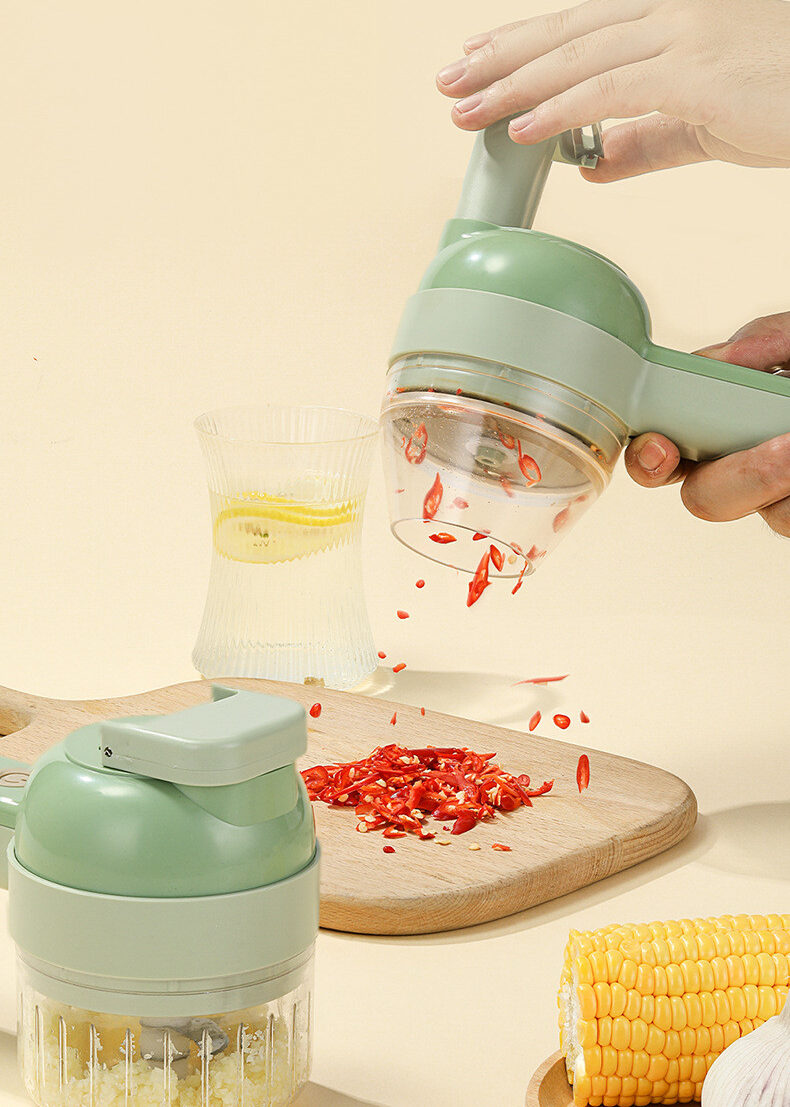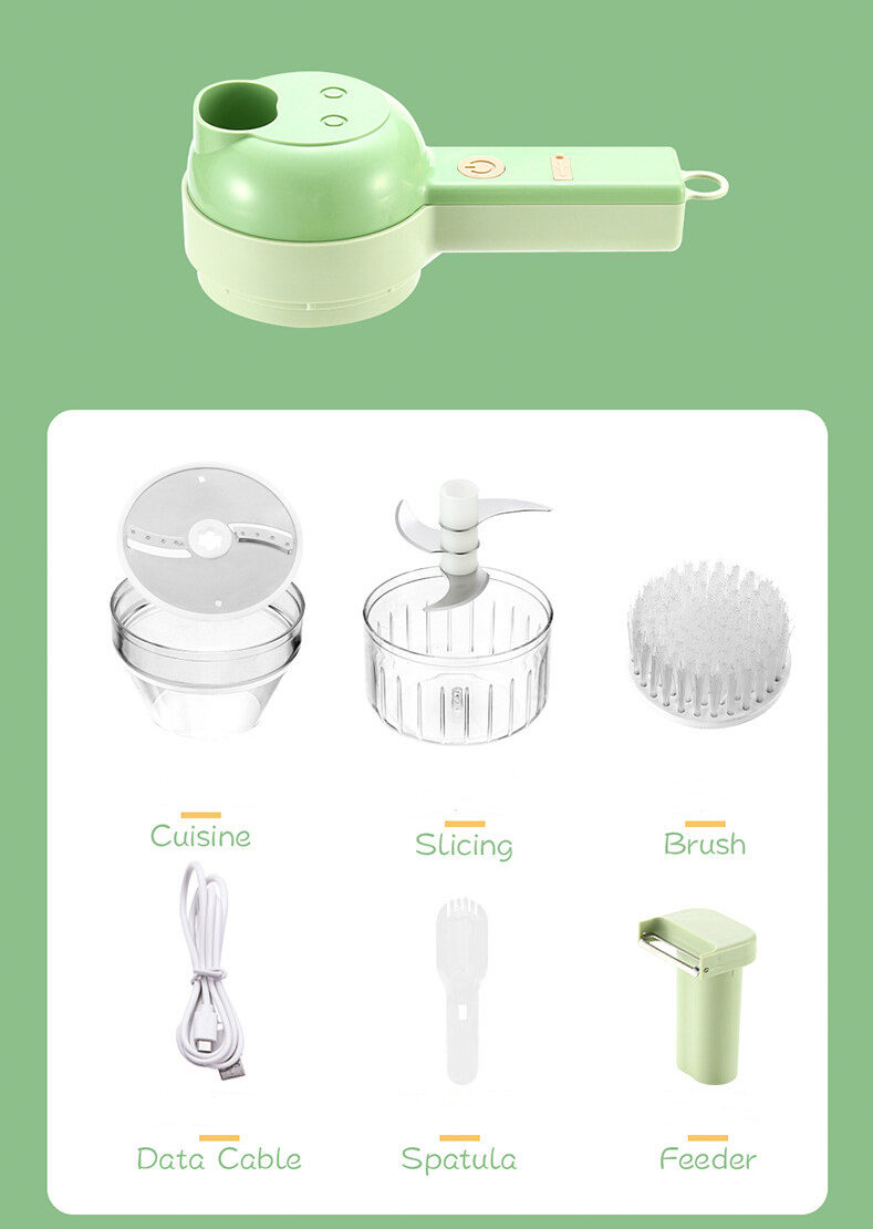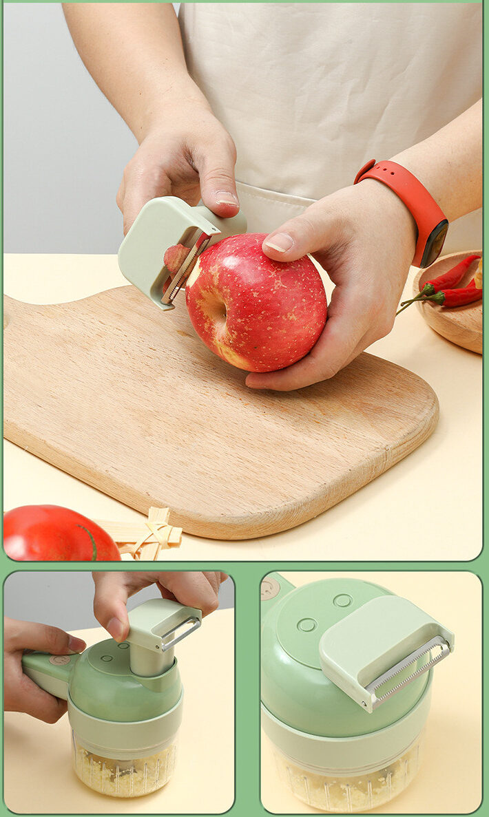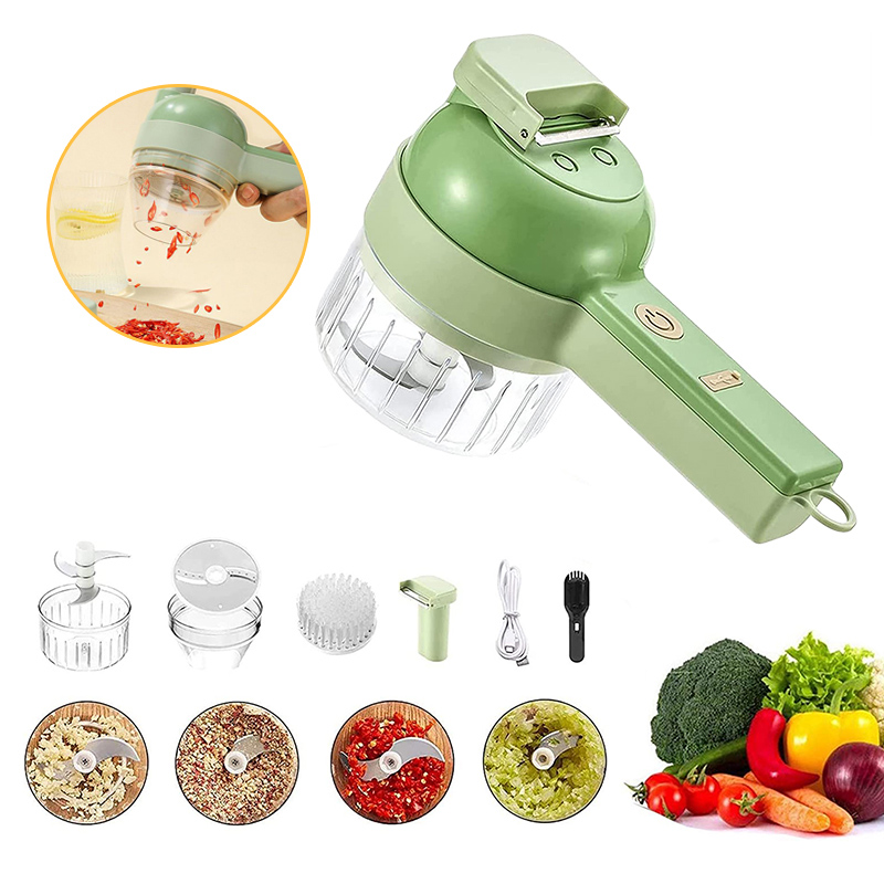 Cortador de verduras eléctrico 4 en 1: el cortador de alimentos eléctrico de mano incluye funciones 4 en 1 como cortar, picar, pelar y cepillo de limpieza. Rompiendo el modo de clic colgante de la pasta de ajo eléctrica tradicional, el diseño ergonómico no cansa sus manos. ¡Úsalo una vez y enamórate de él!